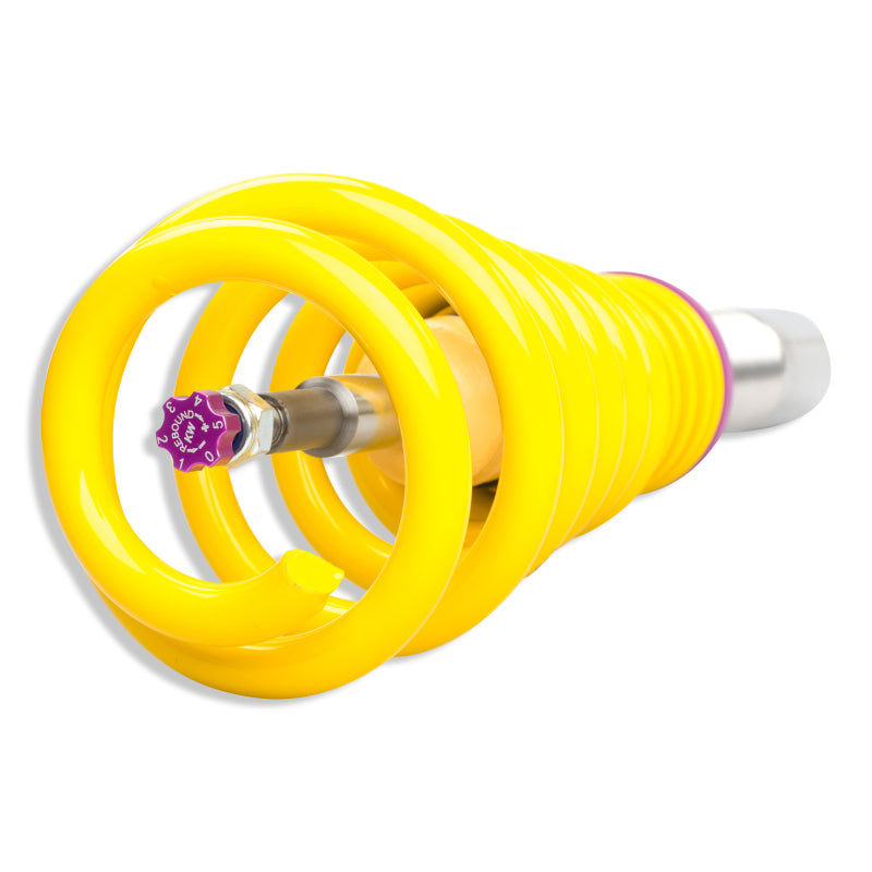 Cutting-edge motorsports technology for more performance on the road. Like every suspension product developed by KW automotive, the suspension manufacturer, and manufactured in Germany, the KW V3 Coilover suspension kit also provides a significant plus in safety reserves in road traffic. Thanks to the chassis with its high-quality dampers, springs, and elastomer spring elements, pitching and rolling movements during load changes such as evasive maneuvers, cornering, acceleration, and braking are significantly reduced. The braking distances are also shortened. Thanks to improved support and feedback, drivers not only feel safer but driving in everyday life becomes even safer. With compression and rebound stage damping, that can be set separately and independently of each other, the damper setup can be customized to your personal driving preferences or vehicle changes such as weight, tire characteristics, or altered vehicle rigidity. True performance optimization is only possible with this unique, patented system. For example, this allows the compression damping force to be increased and get more grip from the tires, to improve cornering behavior and reduce squat without simultaneously altering the rebound stage damping which is optimally matched to the spring rate, a scenario which results in reduced grip and the associated loss of performance. The KW V3 coilover kit is the ideal tool for performance-oriented drivers and experienced tuning enthusiasts who place a strong emphasis on the overall performance of their suspension. The Variant 3 features patented TVR-A and TVC-A technology that provides separately adjustable rebound and compression damping. The extensive adjustment range of the independently configurable rebound and compression make it easy to directly influence the steering behavior, directional stability, grip and handling characteristics for confident and repeatable results at the limit of driving dynamics.