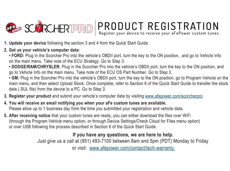 The customer will need to register online (https://afepower.com/scorcherpro/register) and enter their vehicle information to receive his custom tunes. The customer will also have the ability to adjust vehicle parameters such as tire size, axle ratio, and TPMS. The device also stores your vehicle’s factory tune for easy restoration back to the factory settings. Connects to the vehicle’s OBDII port and has Wi-Fi capability so you can download aFe POWER’s custom tunes whenever or wherever you want. Custom tunes can also be downloaded through a PC if desired. Monitor and display critical vehicle data using on-screen, full color customizable gauges. View, capture or download your vehicle’s data on one device. The SCORCHER PRO Performance Programmer offers the capability to read and clear DTC’s (diagnostic trouble codes). SCORCHER PRO Bypass Cable is required (P/N: 77-90009 Sold Separately)